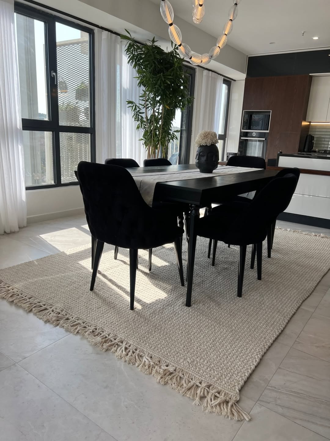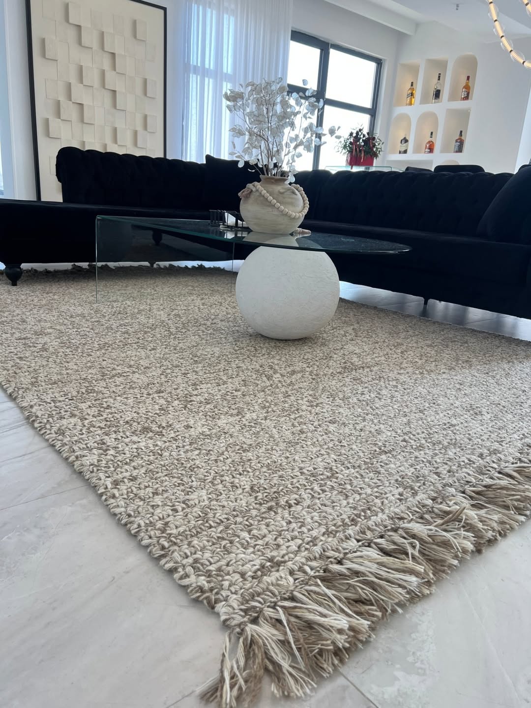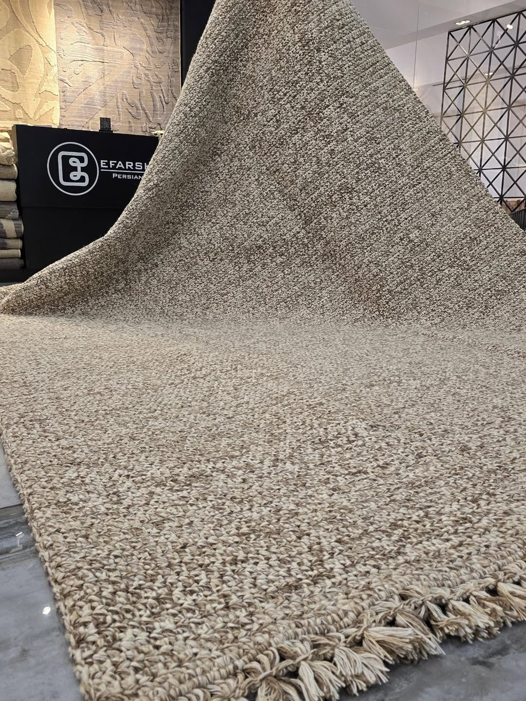 پر فروش ترین رنگ گلیم های درشت بافت با طراحی ساده و لوکس، بافت درشت و رنگهای خنثی (سفید، بژ و کرم) که فضایی گرم و مدرن خلق کرده است.