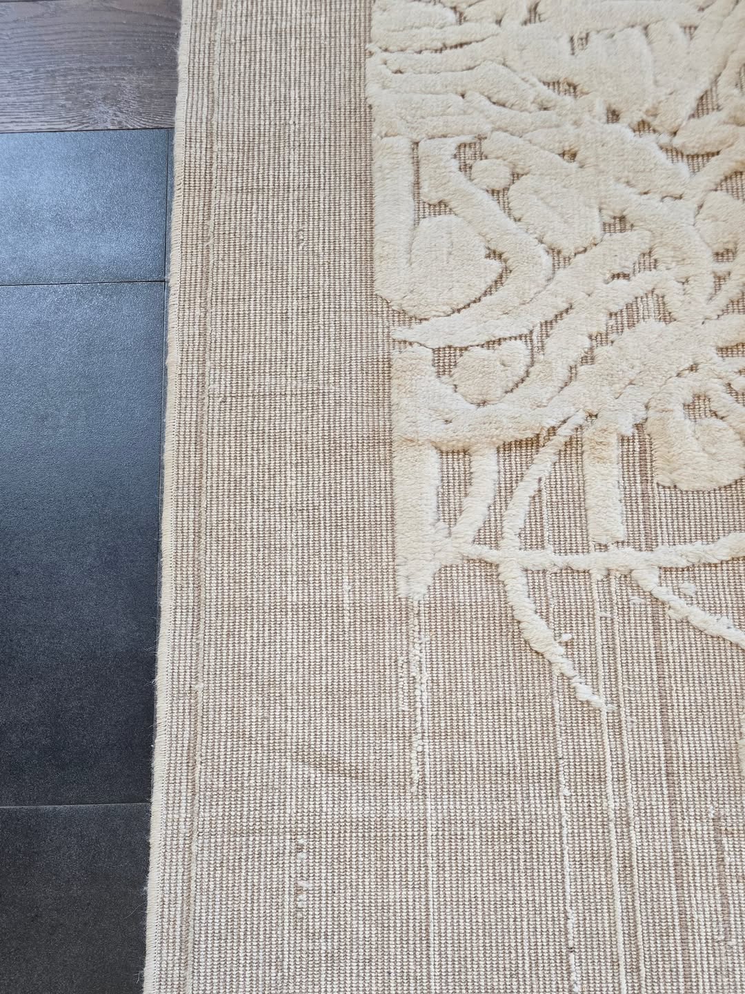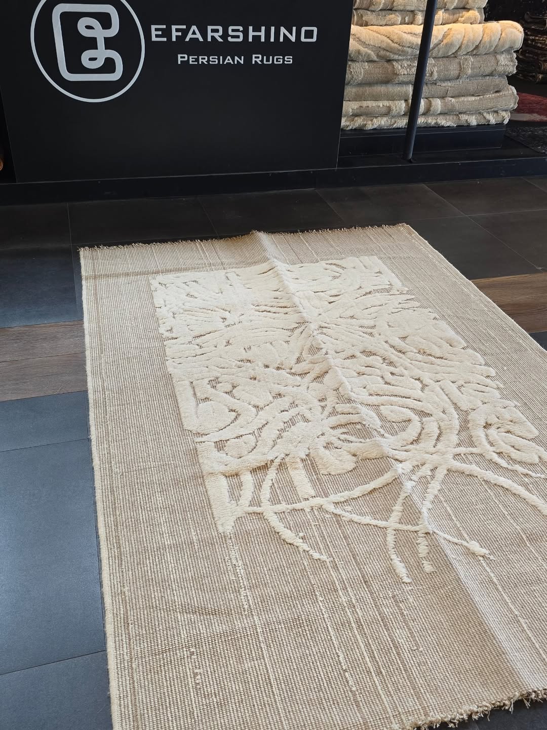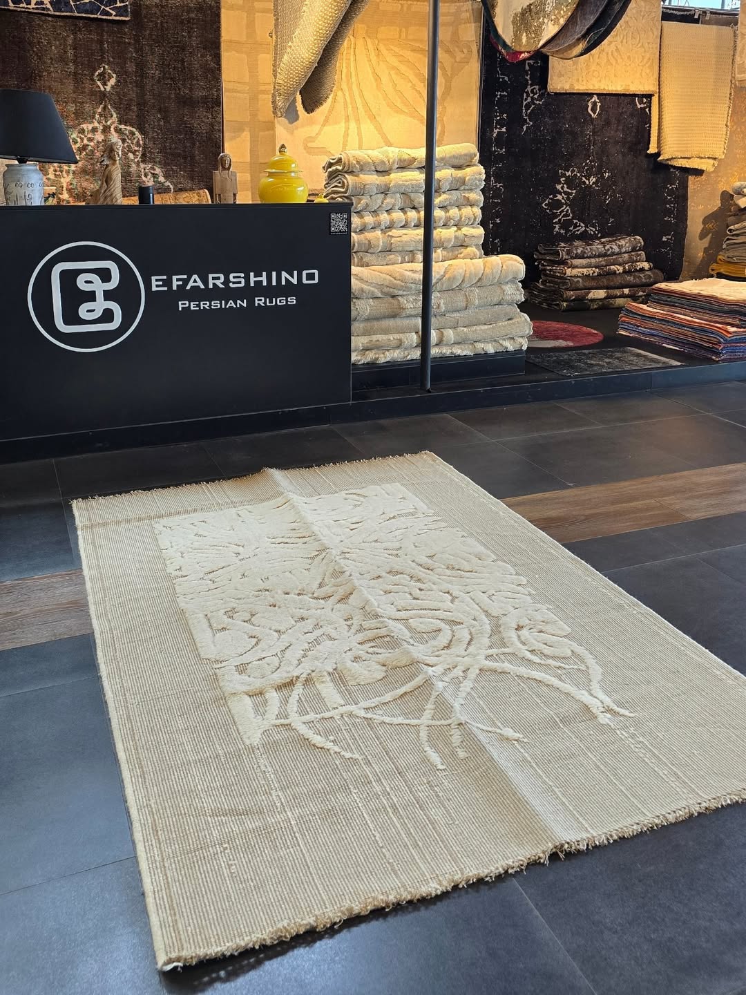 گلیم فرش کالیگرافی بوهمی رنگرزی گیاهی متریال پشم دستریس طراحی و تولید در ایفرشینو. این فرش در سایز سه و شش متر موجود هست و برای فضاهای نشیمن و اتاق خواب چیدمان میشود. با توجه به رنگبندی بژ، سفید و کرم قابلیت تولید در اشکال مربع و مستطیل را دارد.