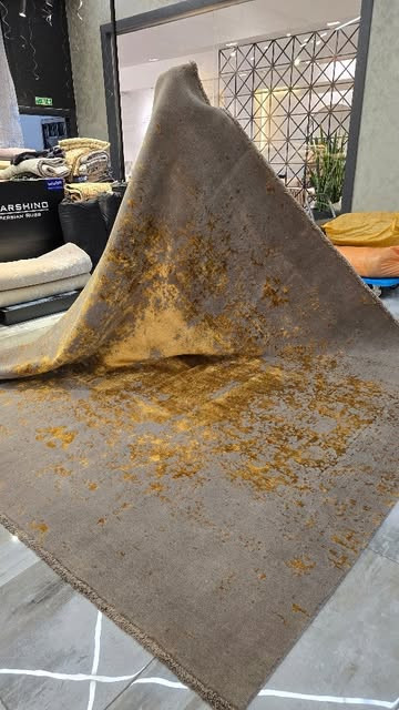 فرش مدرن بافت خاکستری و مسی ترکیبی جادویی برای دکوراسیون مدرن و معاصر،نقشه این فرش از مدرن ترین نقشه های مجموعه ایفرشینو هستش که بعلت استفاده ابریشم بالا در این فرش ،از لطافت خاصی برخوردار هستش.